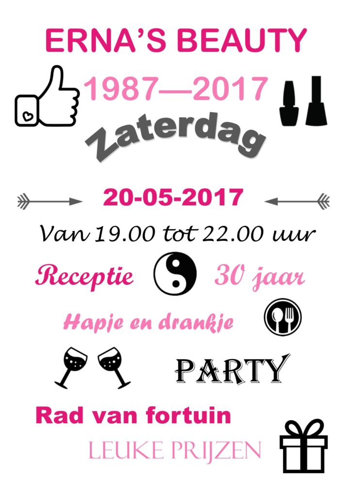Zaterdag 20 mei willen wij het 30 jarig bestaan van Erna’s Beauty vieren onder het genot van een hapje, drankje, tijd voor een gezellig gesprek en geven we leuke prijzen weg. Dus ben je in de gelegenheid om langs te komen, vanaf 19.00 uur ben je van harte welkom op de Elemastraat!