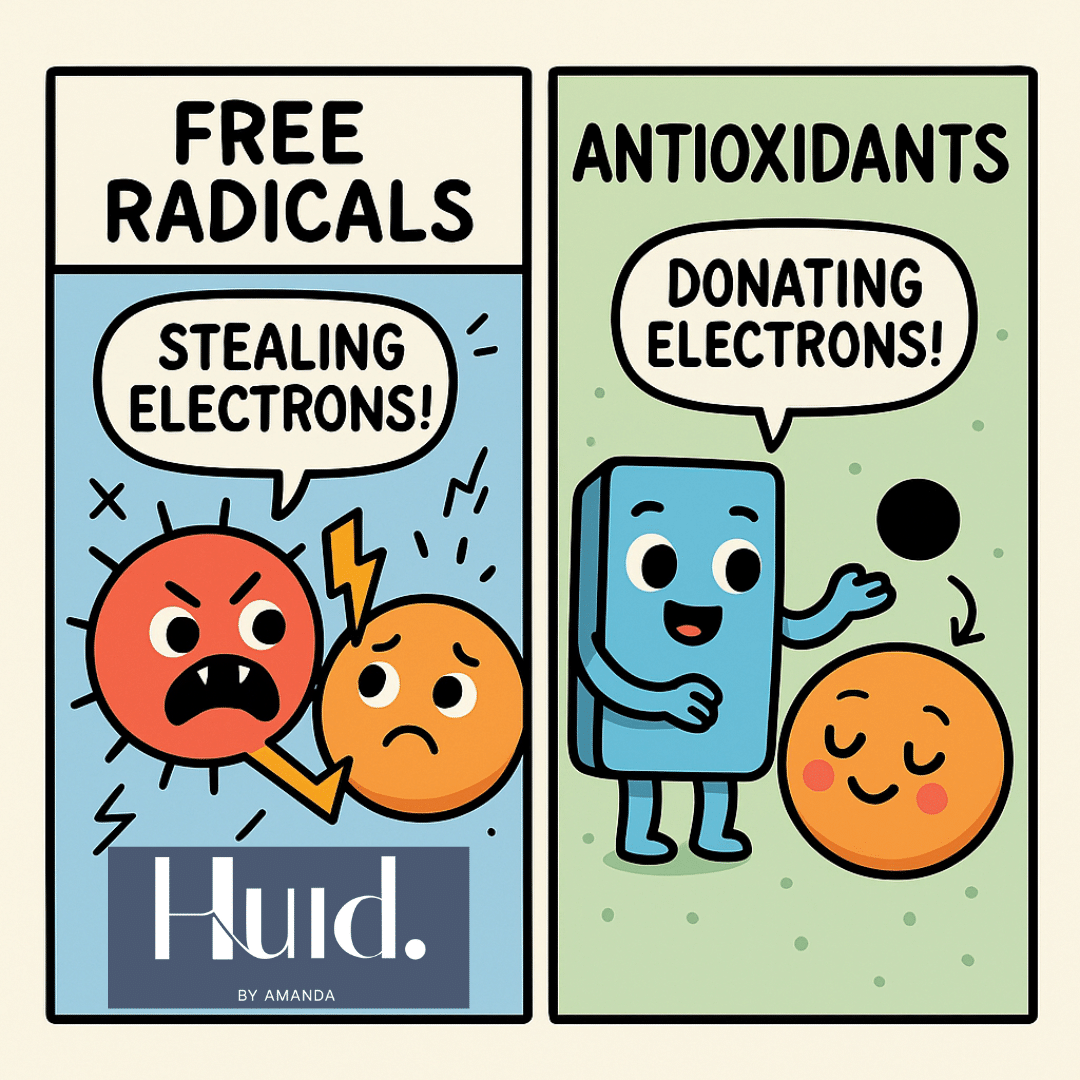 Antioxidanten neutraliseren vrije radicalen door ze een elektron te geven. Zo stoppen ze schade aan je huidcellen en helpen je huid gezond te blijven.